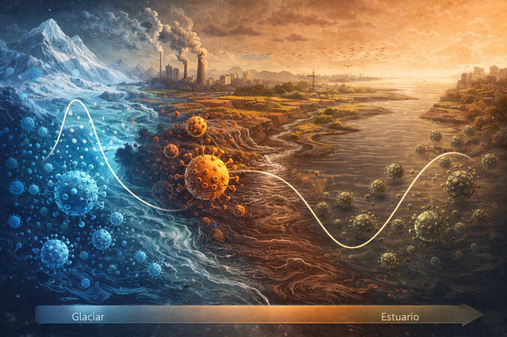 The journey of the Aconcagua River, from glaciers to its mouth, reveals an ecological gradient where viruses seem to accompany — and at the same time reflect — the state of the system. In glacier headwaters, microbial communities are cold, active, and adapted to oligotrophic conditions. There, the virus-to-prokaryote ratio (VPR) reaches the highest values across the entire basin. This elevated proportion suggests strong virus–host interactions, high cellular lysis, and rapid recycling of organic matter. Although nutrient-poor, the system remains dynamic and continuously renewed.